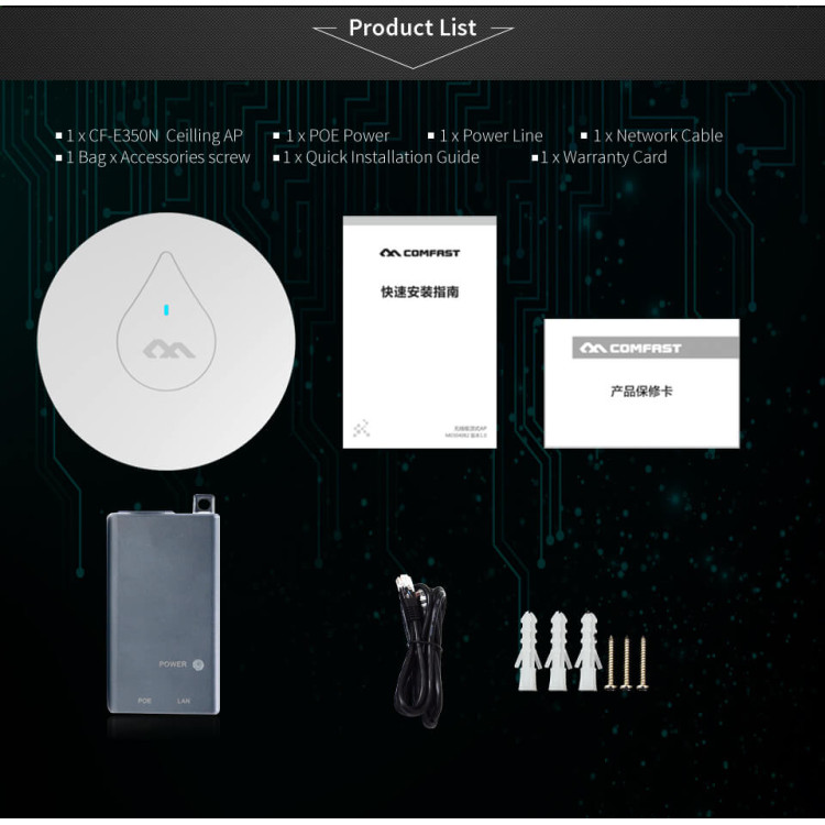 COMFAST CF-E335N 300Mbps high power poe ceiling/wall mounted ap wireless repeater mode make wireless covering and expanding earier and more flexible, can repeat CMCC/AP/wireless router etc. wireless wifi signals. Two or more CF-E335N can make several rooms covered with wifi signals and can expand unlimitedly through the wireless repeater working mode.