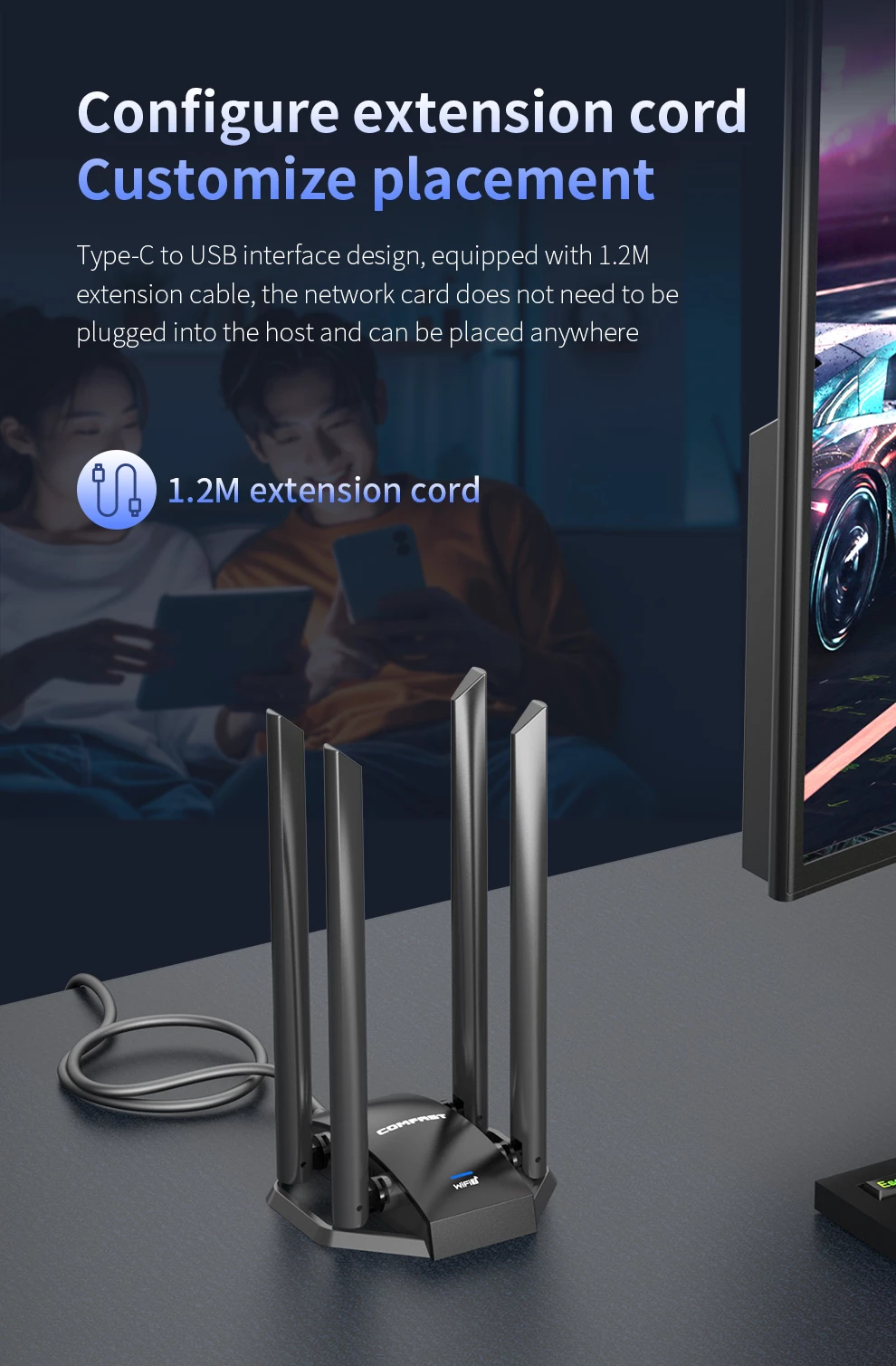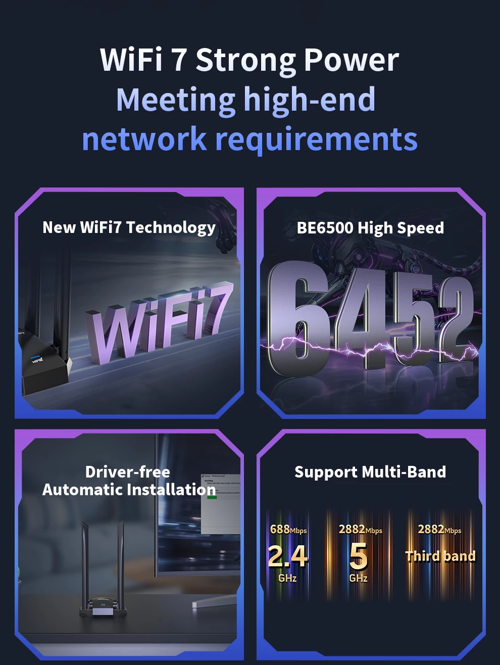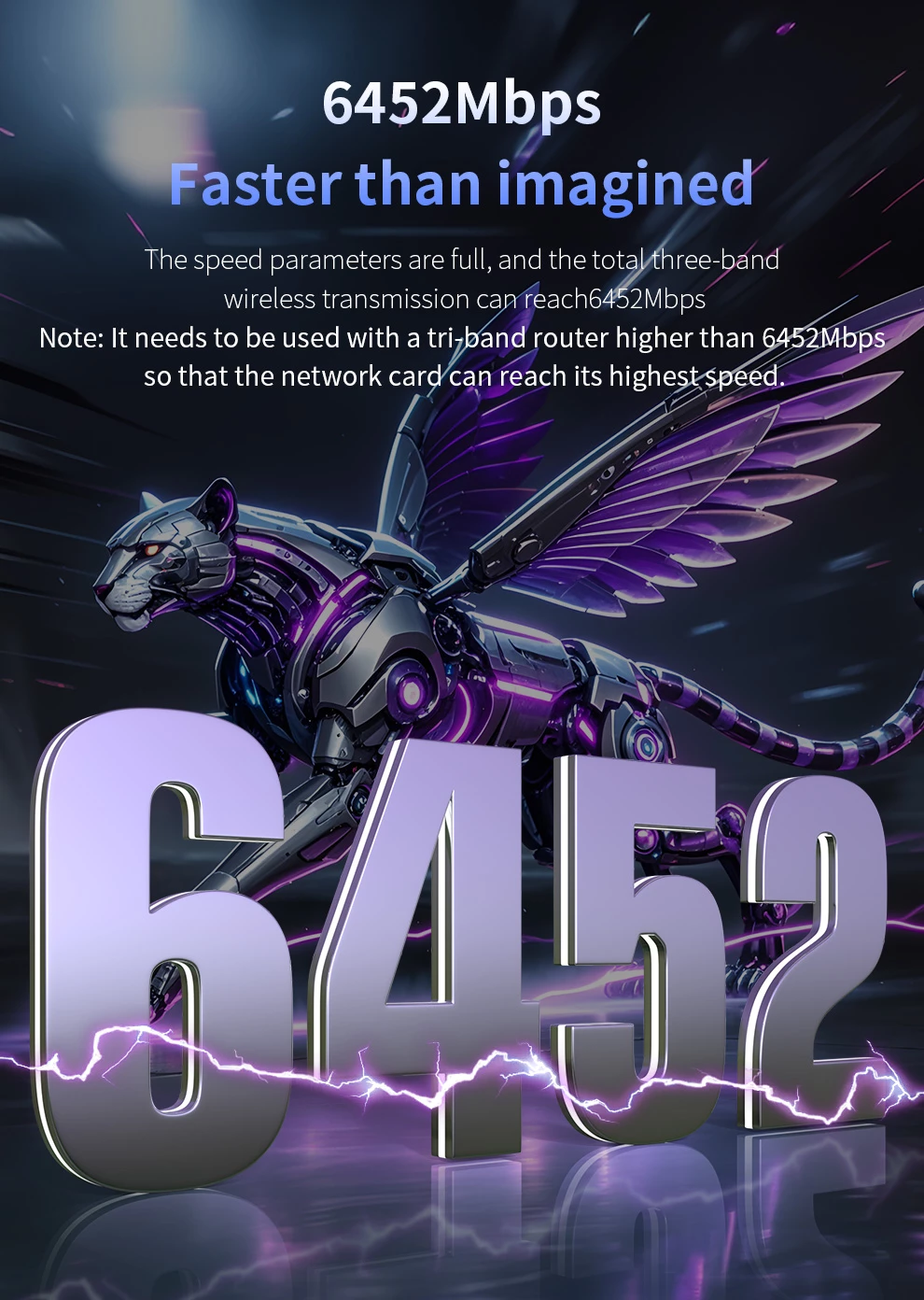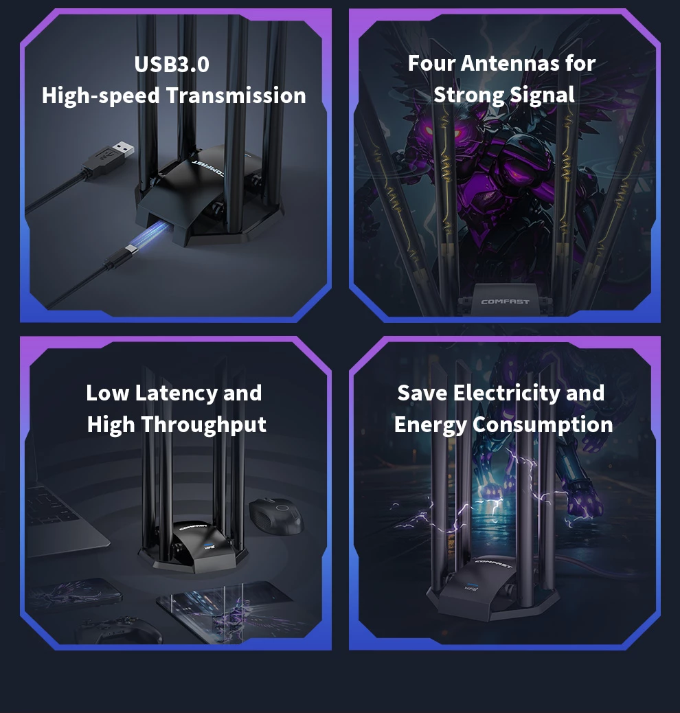 Tri- Band 6452Mbps ; Driver- Free ; High gain Antennas ; Extension code Design